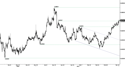 Пара продолжает расти. Часовое сопротивление задано верхней границей канала восходящего тренда. Ключевое сопротивление расположено на отдаленной сейчас отметке 1,0344 (максимум 15 декабря 2016 г.). Ожидается дальнейшее укрепление. В долгосрочной перспективе пара торгуется в диапазоне, сформировавшемся еще в 2011 году, несмотря на некоторую дестабилизацию курса после того, как ШНБ отпустил франк в свободное плавание. Ключевая поддержка находится на уровне 0,8986 (минимум 30 января 2015 г.). Техническая структура с декабря прошлого года указывает на долгосрочный «бычий» тренд с января 2015 г.