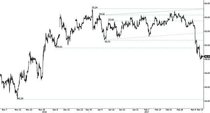 Несмотря на некоторую консолидацию, пара медленно продолжает нисходящее движение после пробития поддержки на уровне 1,2254 (минимум 19 января 2017 г.). GBP/USD открыт путь к дальнейшему ослаблению. Часовое сопротивление задано уровнем 1,2300 (максимум 5 марта 2017 г.). В долгосрочной перспективе техническая картина ухудшилась, т.к. выход Великобритании из состава ЕС открыл паре путь к дальнейшему спаду. Долгосрочная поддержка расположена на уровне 1,0520 (минимум 1 марта 1985 г.). Долгосрочное сопротивление сосредоточено на уровне 1,5018 (максимум 24 июня 2015 г.), его преодоление будет указывать на долгосрочный разворот отрицательного тренда. Но в данный момент такое развитие событий кажется крайне маловероятным.