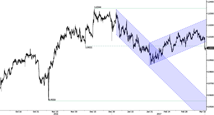 Пара вышла из канала восходящего тренда. Часовая поддержка на уровне 1,0075 (минимум 13 марта 2017 г.) была пробита. Ключевое сопротивление расположено на отдаленной сейчас отметке 1,0344 (максимум 15 декабря 2016 г.). Ожидается дальнейшее укрепление. В долгосрочной перспективе пара торгуется в диапазоне, сформировавшемся еще в 2011 году, несмотря на некоторую дестабилизацию курса после того, как ШНБ отпустил франк в свободное плавание. Ключевая поддержка находится на уровне 0,8986 (минимум 30 января 2015 г.). Техническая структура с декабря прошлого года указывает на долгосрочный «бычий» тренд с января 2015 г.